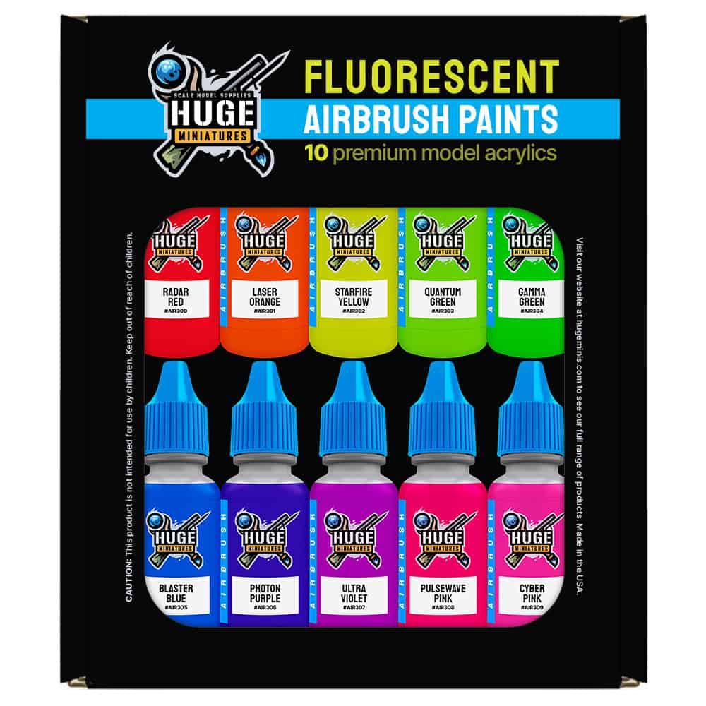 This airbrush color bundle is also available in matching brush on paints. Check out our Fluorescent Paint Bundle.